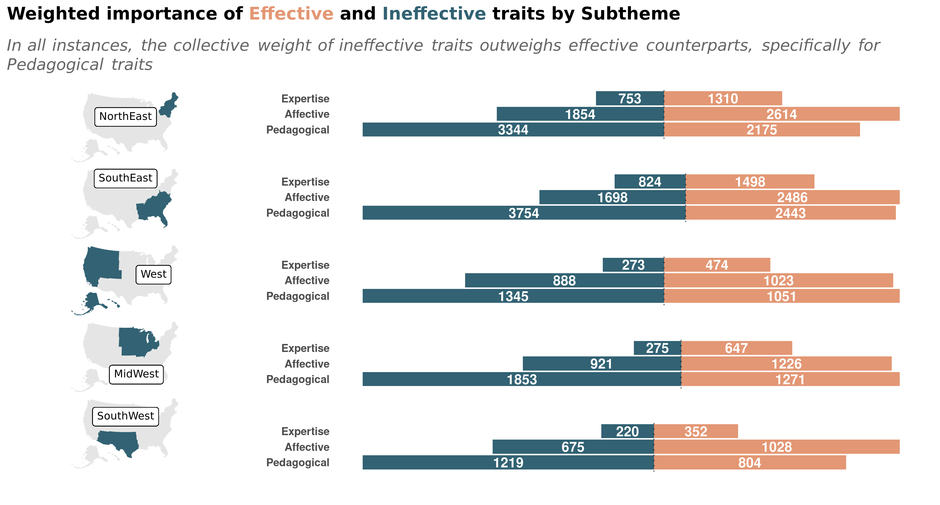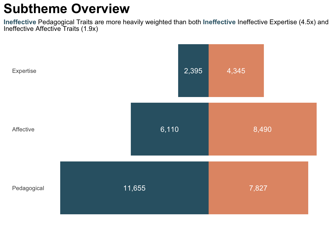 'color: #326273'>**Ineffective**</span> Pedagogy weight the heaviest across the three subthemes of desired/undesired Instructor traits<br>",